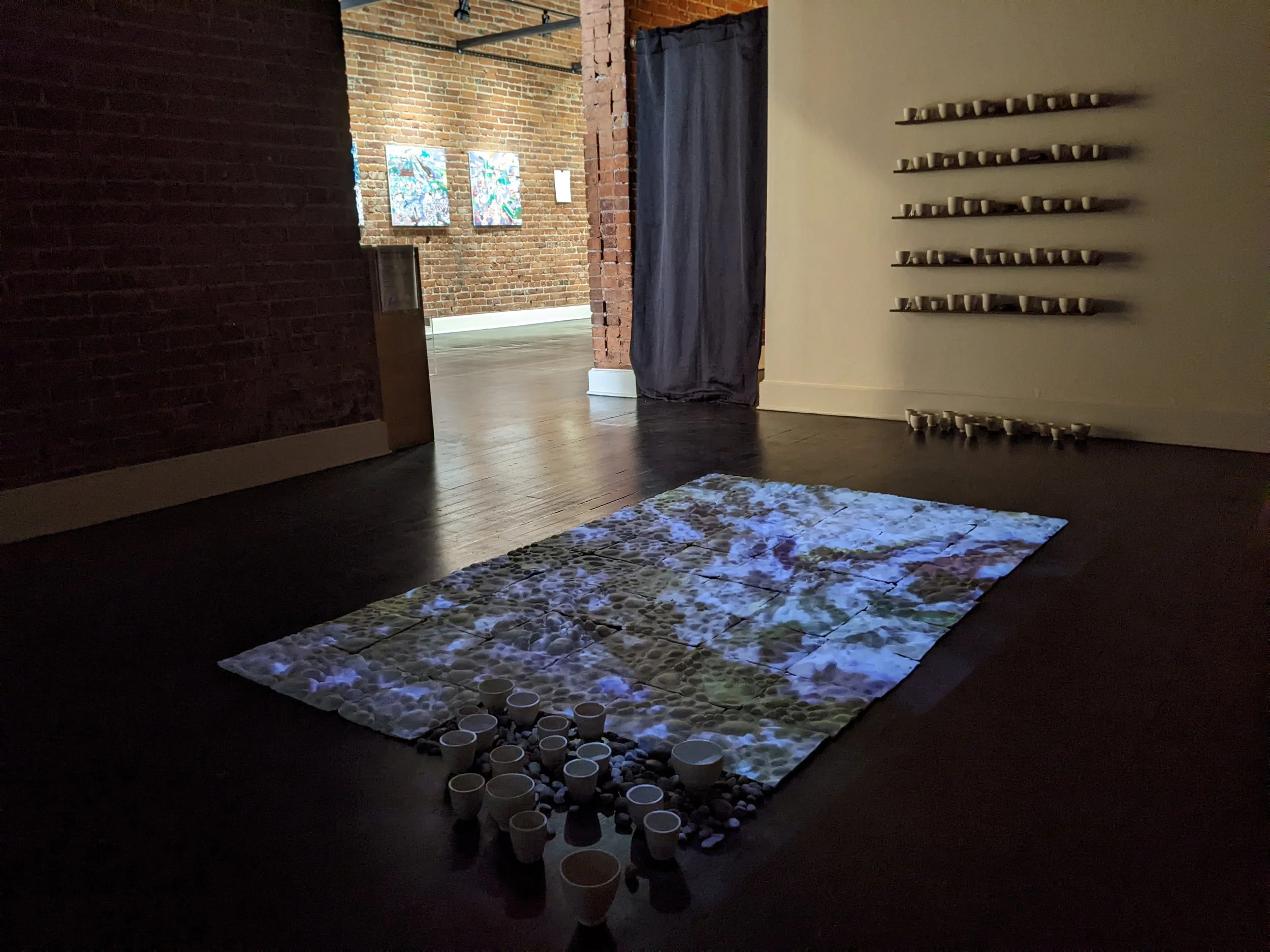 Now We May Begin (2025) porcelain tiles & cups, stones, sound and video (gallery view)